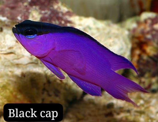 El Blackcap Basslet es una especie de pez bajista que se distingue por su coloración. Su cuerpo es de un tono púrpura o magenta, que contrasta dramáticamente con una capucha o "gorro" de color negro intenso que se extiende desde su hocico hasta el inicio de su aleta dorsal. Son peces de naturaleza pacífica y territorial, que prefieren esconderse en pequeñas cuevas y grietas.