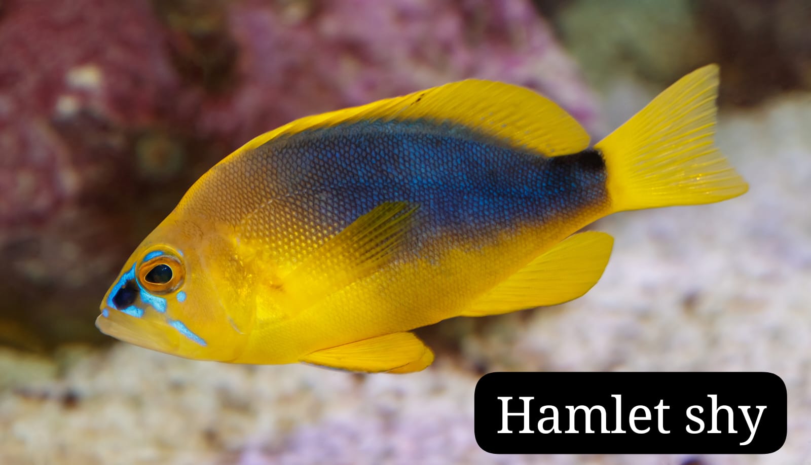 El Hamlet Shy es un pez de la familia de los serránidos que se caracteriza por su distintiva coloración, que incluye un cuerpo amarillo y una franja azul a lo largo de su aleta dorsal. Como su nombre lo indica, es un pez de naturaleza reservada, que prefiere esconderse y explorar lentamente su entorno. Su comportamiento y tamaño lo convierten en una excelente adición para espacios marinos con peces de carácter similar.