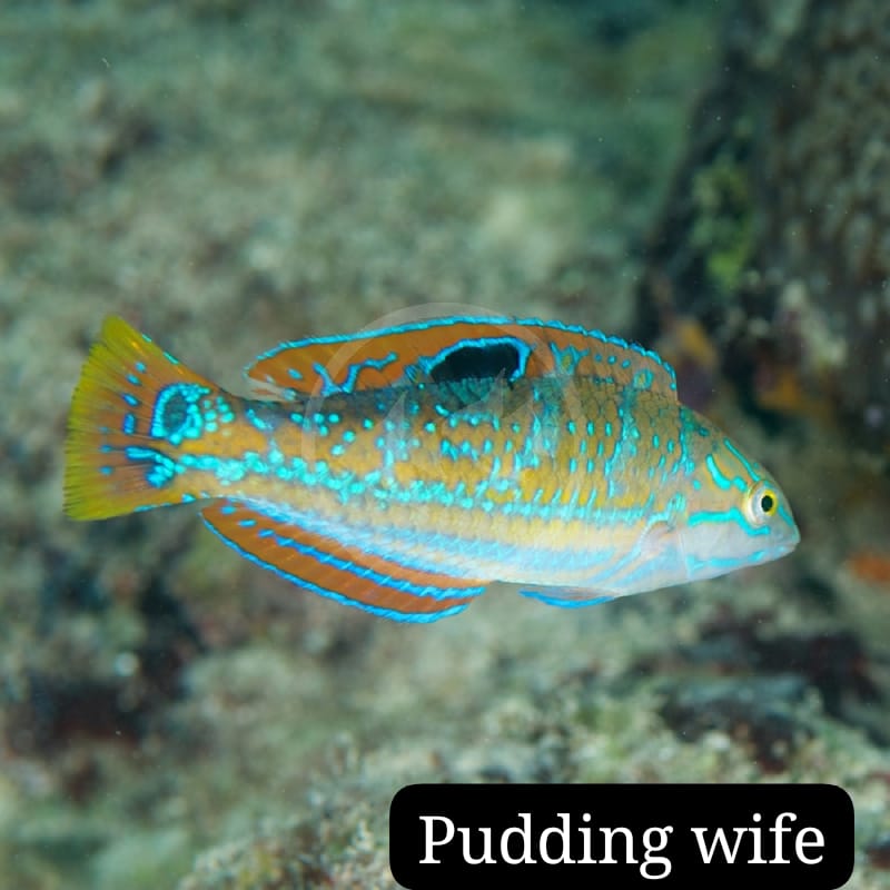 El Pudding Wife es un lábrido con una distribución amplia en el Atlántico occidental. Este pez es fácilmente reconocible por su patrón de colores. Los adultos suelen mostrar una mezcla de tonos azules, verdes, naranjas y amarillos con un patrón de líneas en la cabeza. Los juveniles, por su parte, tienen un patrón de coloración completamente diferente. Es un pez activo y curioso, que puede convertirse en el centro de atención. Por su tamaño y temperamento, es una adición espectacular para un acuario de arrecife con peces de tamaño similar.
